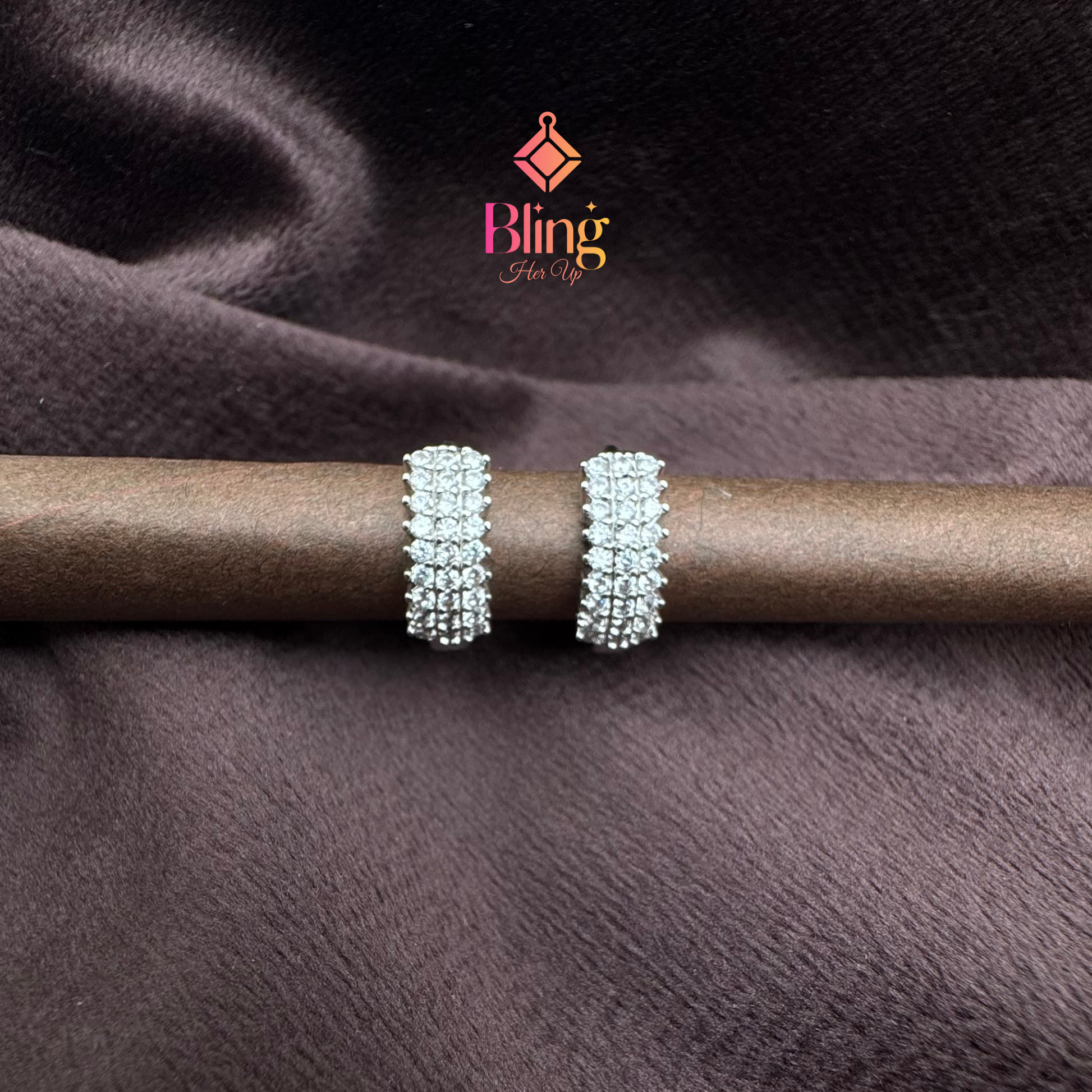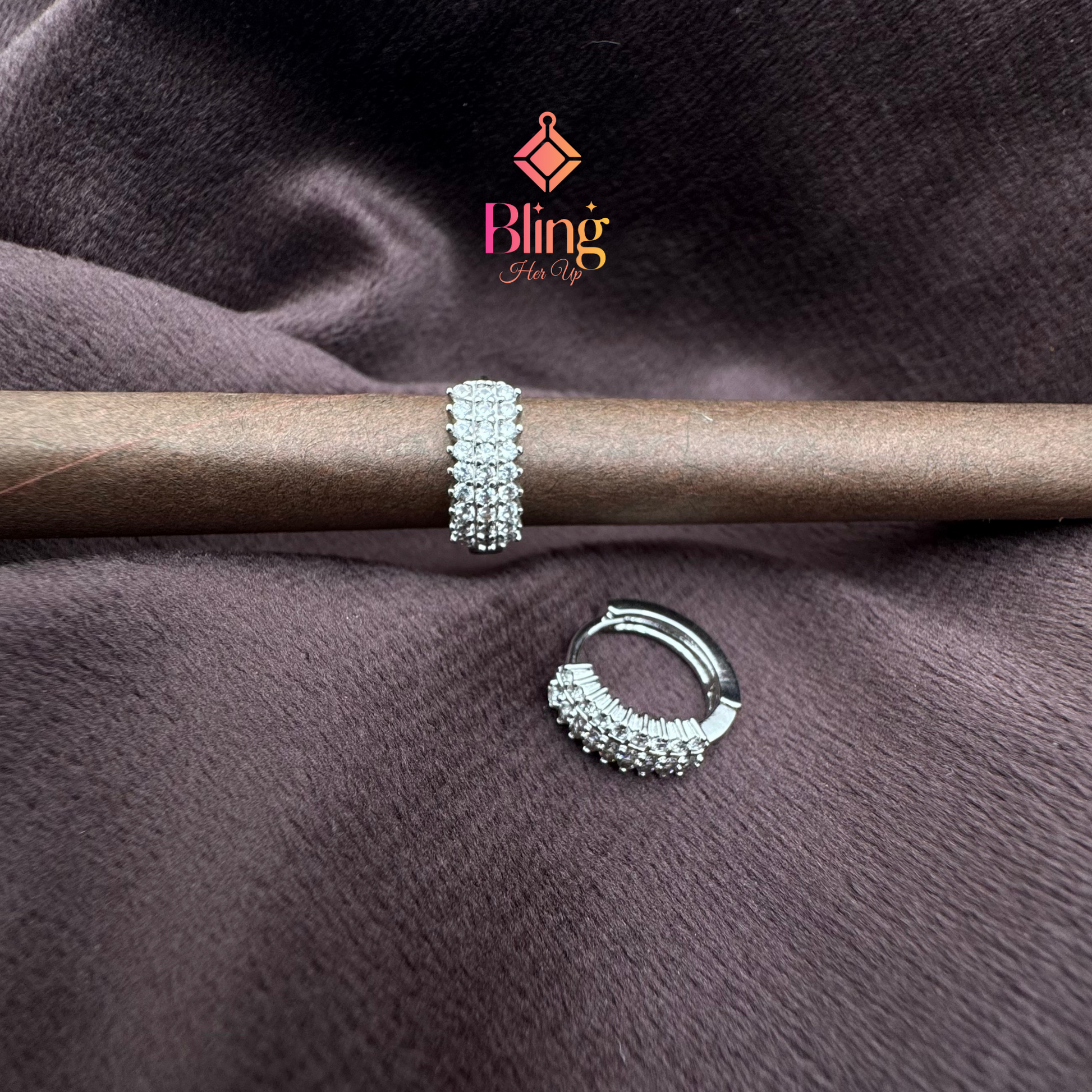 Step into the spotlight with our Triple Sparkle Huggies – a symphony of shimmer in an elegant anti-tarnish rose gold setting. Featuring three rows of precision-set crystals, these earrings embody sophistication with a touch of bold glamour. Their sleek huggie silhouette hugs the ear comfortably, making them perfect for dressing up your everyday or adding brilliance to your nights out. Style, comfort, and sparkle – all in one irresistible pair.