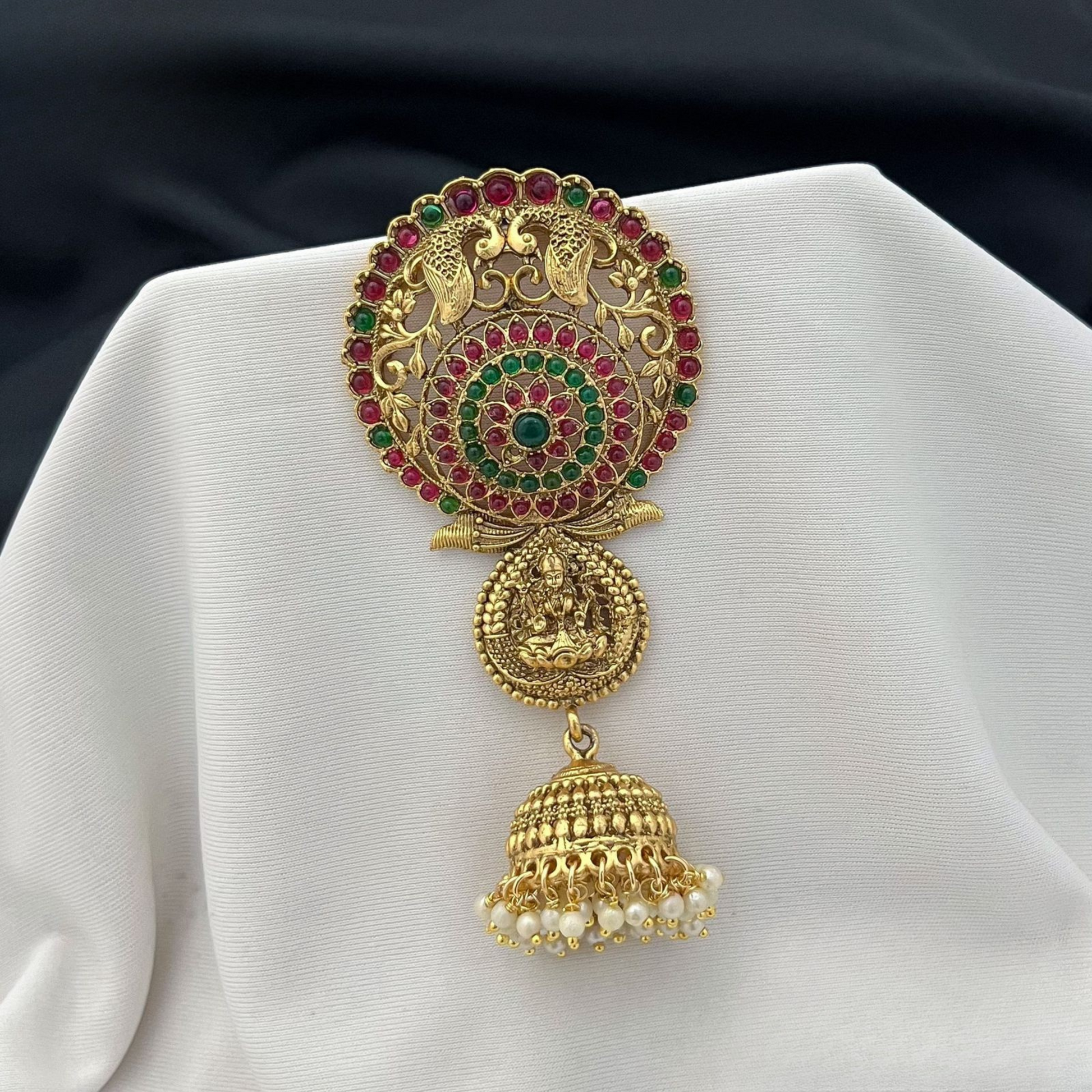 Channel divine grace and timeless tradition with the Devi Lakshmi hair clip — a beautifully crafted piece featuring the serene form of Goddess Lakshmi, the symbol of wealth, prosperity, and purity. Designed with intricate temple-style detailing and an antique gold finish, this clip adds a sacred elegance to your festive and bridal looks.