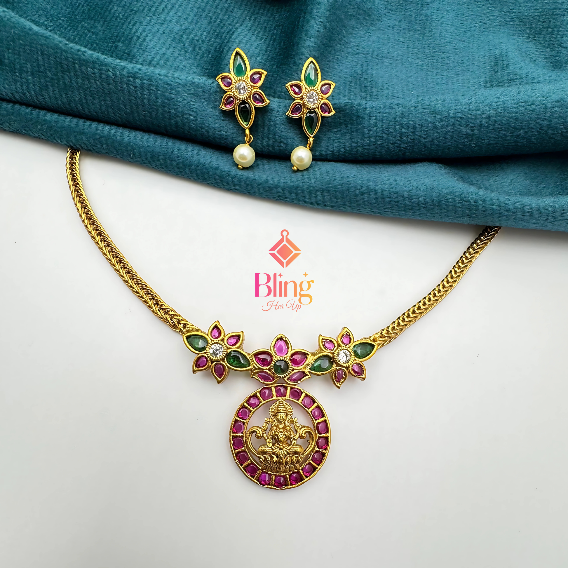 Step into divine elegance with our Lakshmi Attigai Temple Jewelry Set, a true celebration of South Indian heritage. This premium-quality Attigai-style necklace features a captivating Lakshmi pendant, symbolizing prosperity and grace, surrounded by vibrant pink stones and floral accents. Paired with delicately crafted earrings adorned with green and pink stones, American diamonds, and pearl drops, this set offers unmatched traditional charm. Crafted with an antique gold-plated finish, this lightweight, skin-safe, and anti-tarnish set is perfect for festivals, weddings, and timeless celebrations of culture.
