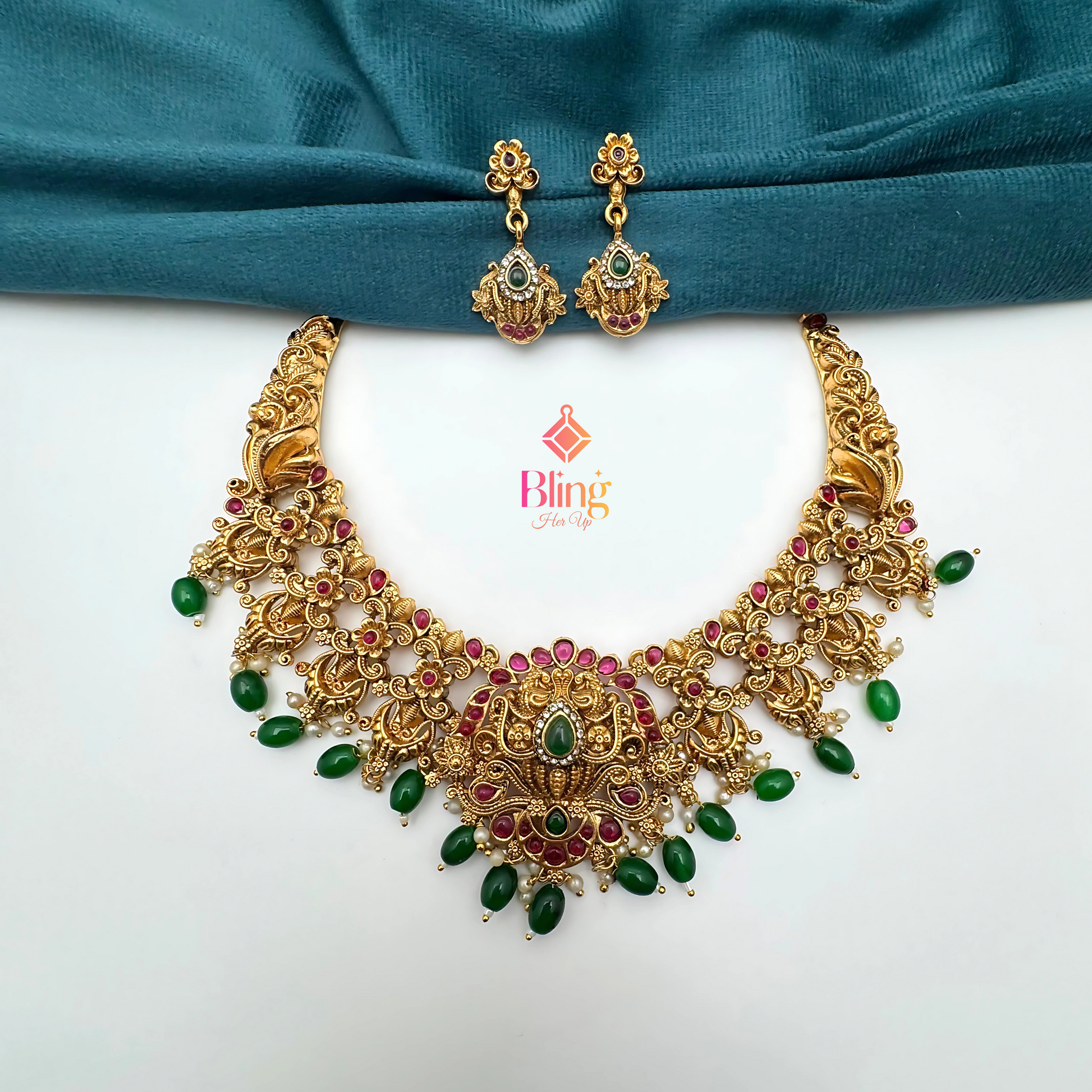 Invoke timeless elegance with the Mahalaya Heritage Temple Necklace Set, a breathtaking blend of divine craftsmanship and floral artistry. This opulent creation features a grand central medallion with antique motifs, surrounded by clusters of temple-inspired floral engravings, vivid ruby stones, and lush green drop beads that emulate traditional South Indian aesthetics.