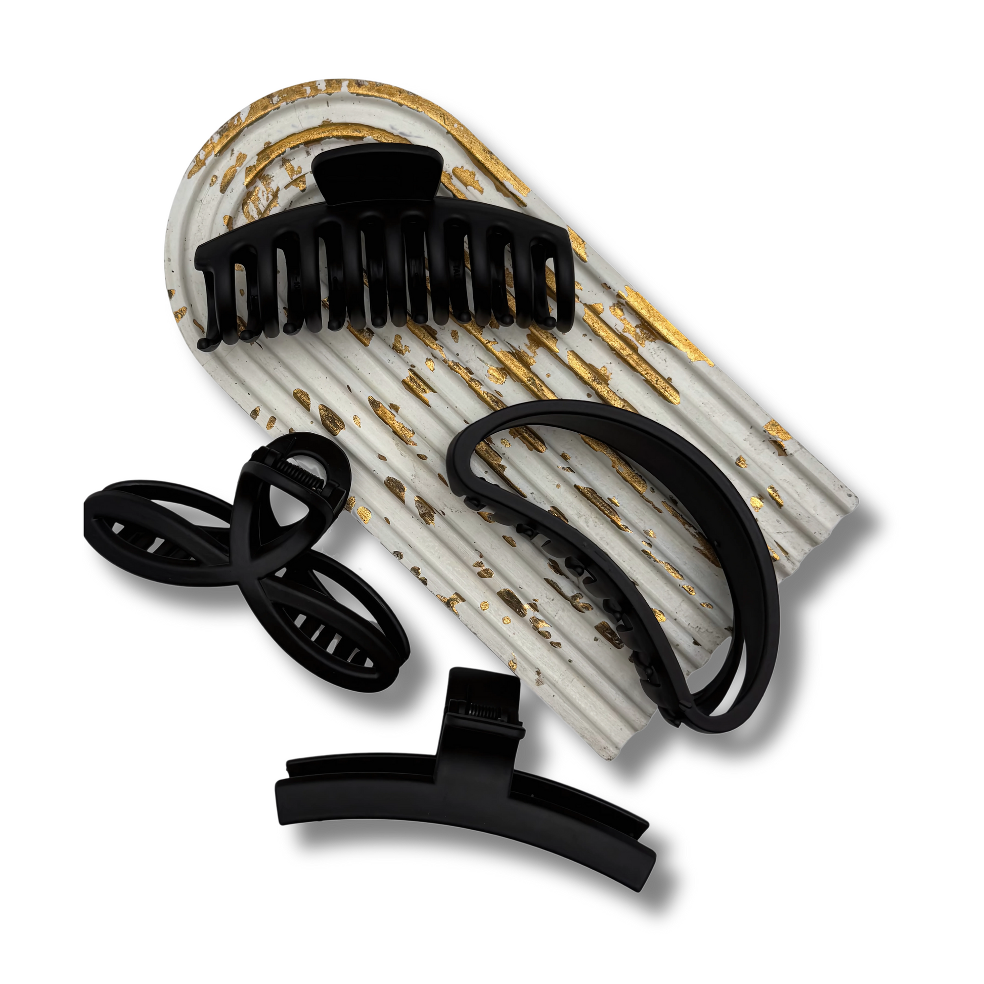 Style meets strength with the Matte Muse Collection – a 4-piece set of sturdy, matte-finish hair claw clips designed to handle all hair types. Whether you're running errands, working out, or dressing up for the day, these clips provide a secure, comfortable hold without slipping. Their sleek black matte design adds a touch of elegance to any look.